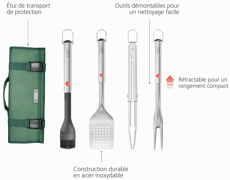 Avec GrillOut™ Joseph® Joseph propose une vision innovante du barbecue moderne : des ustensiles parfaitement conçus pour une utilisation en extérieur, alliant praticité, compacité et design fonctionnel. Cette gamme a été pensée pour répondre aux contraintes réelles des repas en plein air, tout en conservant l’exigence de qualité propre à la marque britannique.