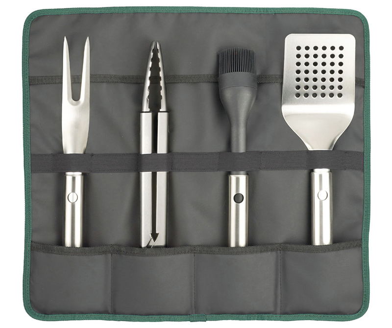Complétez votre équipement de barbecue avec cet ensemble de 4 ustensiles, comprenant un pinceau à badigeonner, des pinces, une spatule et une fourchette, accompagnés d’un étui pliable pour un rangement sécurisé et un transport facile.