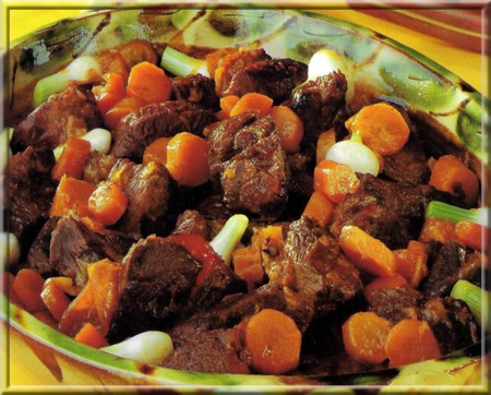 5. Éplucher les carottes et les coupe en rondelles. Éplucher les oignons grelots. Ajouter ces 2 légumes à la viande. Poursuivre la cuisson 1 h 30.