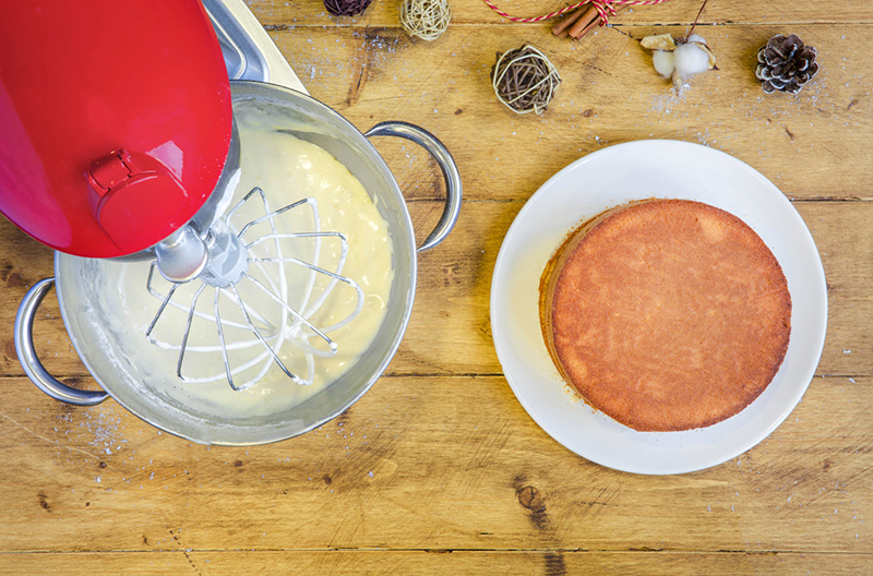 ≻ Couper la génoise en 4 disques égaux, puncher le 2ème et le 4ème avec le sirop.