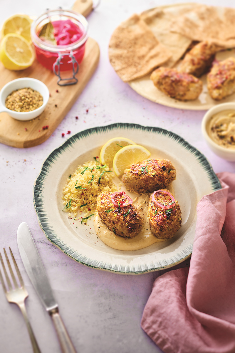 Déguster les keftas servis sur une assiette ou en sandwich dans un pain pita, avec du houmous, des pickles d’oignon rouge, du citron, du boulgour et des herbes fraîches.