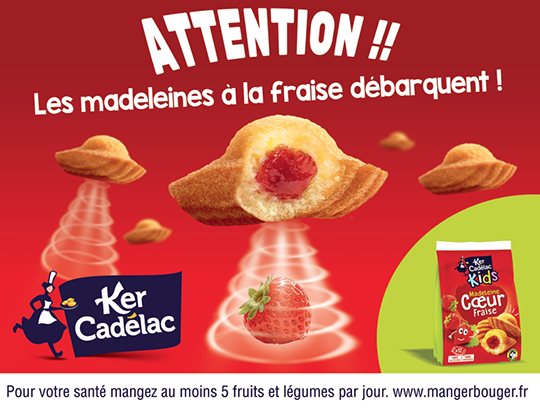 Ker Cadélac lance une nouvelle marque, Ker Cadélac Kids, qui comme son nom l’indique, a pour vocation de séduire les enfants. Deux références sont disponibles dans les linéaires de la grande distribution : la Madeleine Cœur Fraise et la Madeleine Cœur Chocolat goût Noisette.