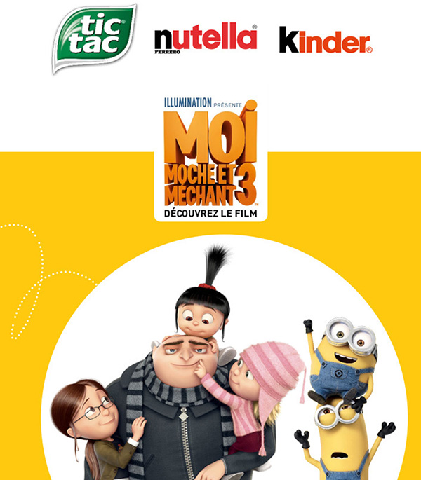 Tic Tac®, à partir du mois de juin, ainsi que Nutella® et Kinder® à la rentrée de septembre 2017, rendent hommage aux personnages iconiques des FILMS ‘‘Moi, Moche et Méchant’’ : Les Minions – petits êtres jaunes aussi attachants qu’amusants – accompagnés de Gru, personnage emblématique des FILMS ‘‘Moi, Moche et Méchant’’, deviennent les stars de nos marques préférées !