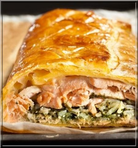 Il sera plus rapide à préparer en utilisant un beau filet de saumon et des épinards surgelés. Et si on ne dispose pas de pâte feuilletée (pur beurre) en rectangle, deux rouleaux de pâte à tarte conviendront (de la marque Marie). Elle s’étire bien et permet de faire des bords larges très légers après cuisson.