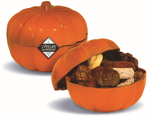 Emblématique d’Halloween, la Citrouille de L’Atelier du Chocolat, traitée comme un précieux écrin de chocolat au lait fondant, recèle bien des surprises.