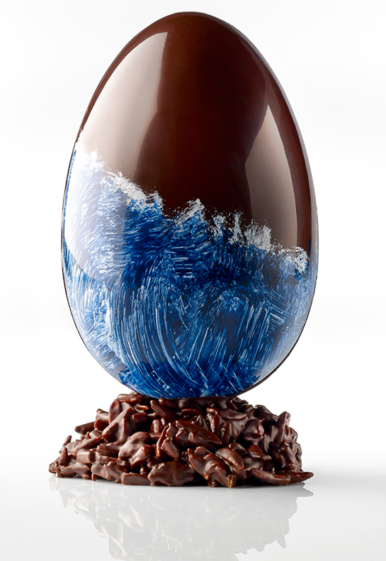 En 2014, l’œuf de Pâques Henri Le Roux est un doux souvenir de Bretagne. Posé sur un socle d’amandes caramélisées enrobées de chocolat, l’œuf « Embruns » reprend la représentation de vagues s’abattant sur les rochers des côtes bretonnes, illustrant le côté vivifiant des marées, l’air parfumé d’embruns.