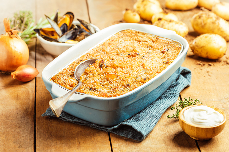 La madeleine de Proust des bretons s’invite au four et marie la chair des moules bretonnes avec des pommes de terre rissolées, pour un plat réconfortant. Il prend sa saveur typique avec l’irremplaçable sauce marinière, version gratin !