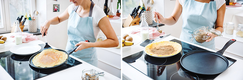 ★ La crêpière PRO INDUC, en aluminium d’une épaisseur de 3 mm, légère et compatible induction pour les petits budgets.