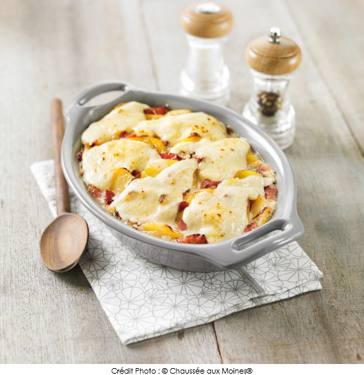 Variante : Couper le Chaussée aux Moines® en 2 dans l’épaisseur et retirer un peu de croûte au niveau des rebords, puis le poser sur les pommes de terre avant de mettre le plat au four.