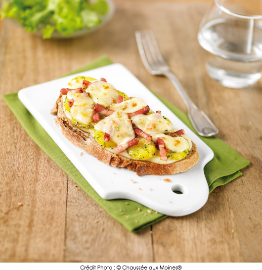 ⑥• Couper le Chaussée aux Moines en lamelles et en recouvrir les tartines. Passer quelques minutes sous le grill du four, jusqu’à ce que le dessus soit gratiné.