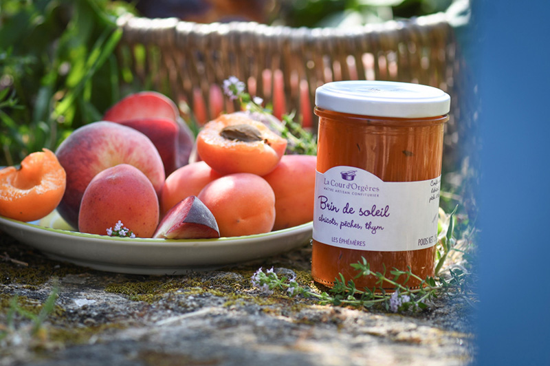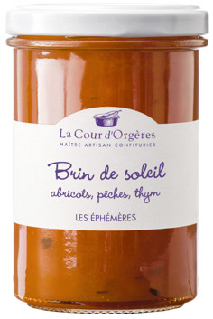 Pour les maîtres confituriers de la Cour d’Orgères, la confiture est un mets exquis qui se cuisine du petit déjeuner au dîner et de l’apéritif au dessert. La preuve avec cette sublime confiture abricot-pêche relevée de thym en fleurs, qui révolutionne les barbecues et les pique-niques de l’été. Un pur délice à tester sur un toast grillé tartiné de fromage de chèvre et son filet d'huile d'olive, avec un rôti de porc froid accompagné de tranches de pêches fraîches, en laquage d’un magret de canard ou encore dans la sauce chaude d’un poulet rôti. Pour les inconditionnels du sucré, ce Brin de soleil fait aussi merveille en fond de tarte, avec une génoise ou en gâteau roulé.