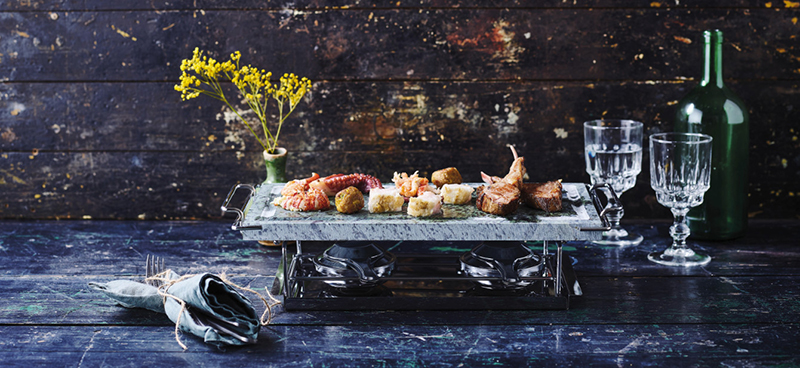 ★ Stone Grill, la pierre à griller en marbre, son plat inox, le réchaud chromé et deux brûleurs