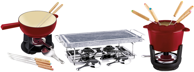 en bois et acier inox, un caquelon en fonte émaillée, un