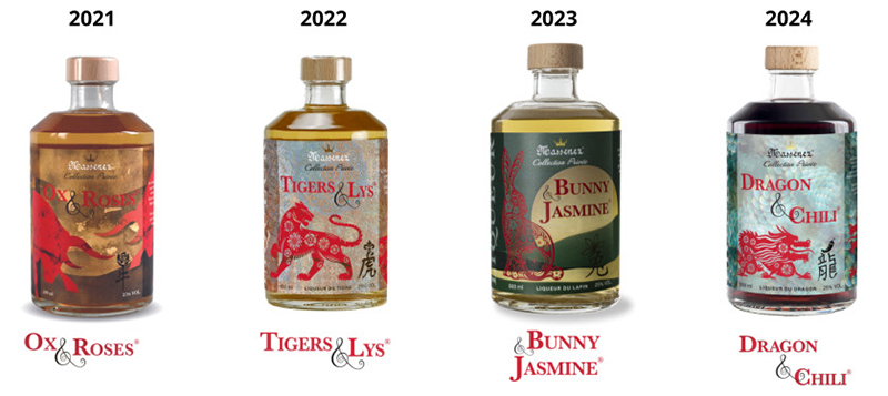 La Distillerie Massenez met tout son savoir-faire en œuvre pour donner vie à des liqueurs uniques, en Édition Limitée, destinées aux amateurs de spiritueux rares et de qualité exceptionnelle et imaginées par les Maîtres liquoristes. En effet, soixante liqueurs exceptionnelles vont trouver, au cours des années, leur inspiration dans les douze signes du zodiaque chinois (Buffle, Tigre, Lapin, Dragon, Serpent, Cheval, Chèvre, Singe, Coq, Chien, Cochon et Rat) associés aux cinq éléments cosmologiques (feu, eau, bois, métal et terre).