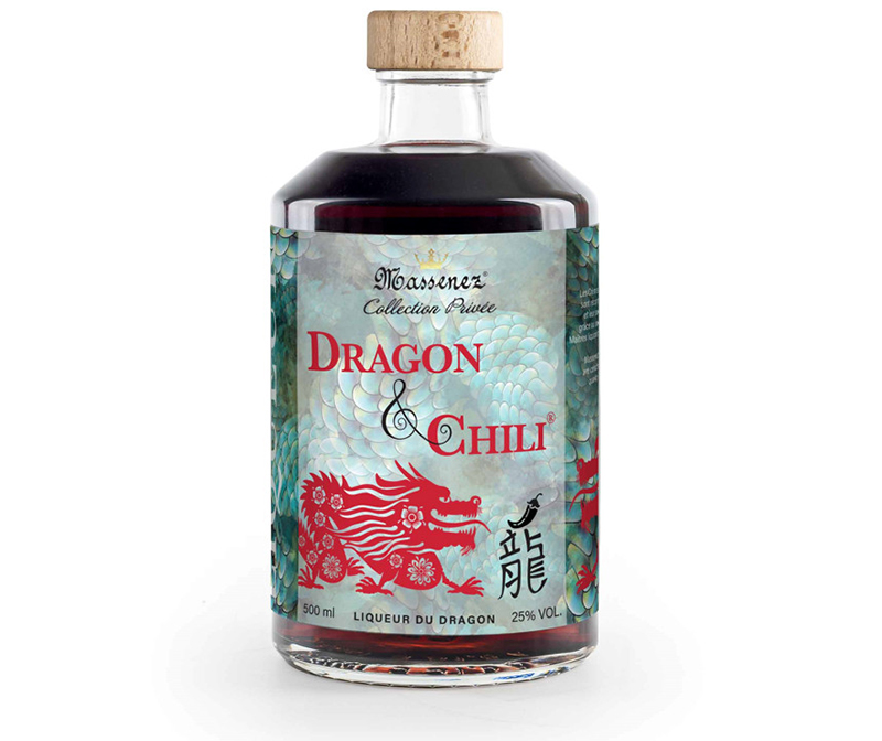 Dragon & Chili® est le quatrième volet de la Collection Privée Massenez en Édition Limitée et numérotée après les trois opus précédents : Ox & Roses®, dédié à l'année du Buffle et élaboré à partir d'un Cognac jeune, Tigers & Lys® en hommage à l'année du Tigre, façonné à partir d'un Blended Scotch Whisky, et Bunny & Jasmine®, pour l’année du lapin, composé d’un délicat Calvados et d’une liqueur de carotte.