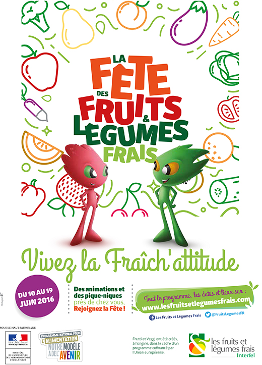 Après 11 années d’existence, la Semaine fraîch’attitude change de peau et devient LA FÊTE DES FRUITS & LÉGUMES FRAIS. Ce nouveau concept, mis en place par Interfel, l’interprofession des fruits et légumes frais, propose au grand-public de (re)découvrir les fruits et légumes frais d’une manière ludique, festive et conviviale. Du 10 au 19 juin 2016, petits et grands sont invités à vivre la #Fraîchattitude en famille ou entre amis à travers de nombreuses animations aux quatre coins de l’Hexagone, mais surtout… en participant au concours du plus beau pique-nique de France et à une chasse au trésor culinaire, à la recherche du #Krokanfondant, sous l’œil bienveillant des mascottes Frutti et Veggi !