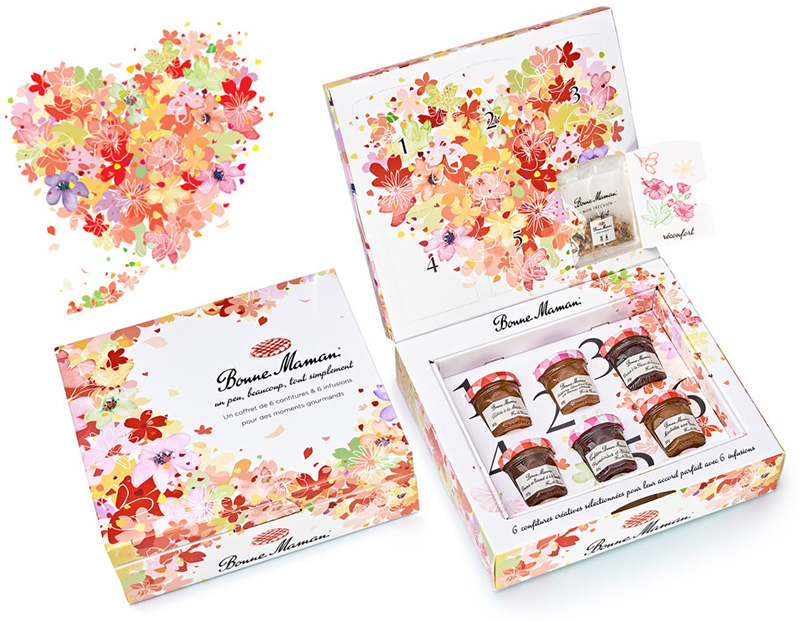 À l’ouverture du coffret, les confitures apparaissent dans leur écrin. Et derrière chaque case, se cache une infusion à déguster avec la confiture conseillée par Bonne Maman® pour former un duo d’accords parfaits.