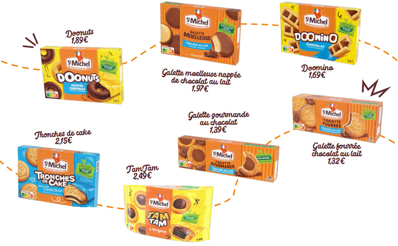 Lorsque St Michel met son savoir-faire au service de l’innovation des goûters, la promesse est tenue. Doonuts, Galette Moelleuse nappée de chocolat au lait, Galette Fourrée chocolat au lait, Galette Gourmande au chocolat, Doomino, TamTam, ou encore Tronches de cake, chacun pourra y trouver son bonheur.