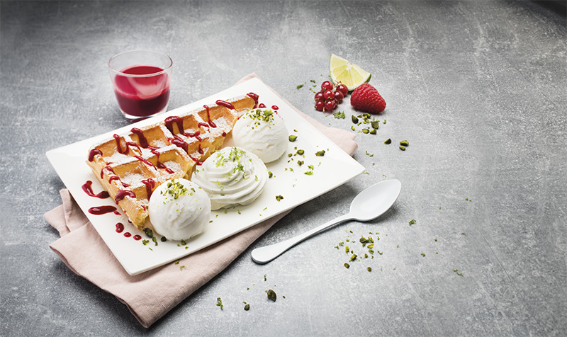 Une mise en scène sacrément gaufrée mêlant l’acidité du sorbet citron à la douceur sucrée du coulis de fruits rouges. Comble de la gourmandise, une onctueuse crème fouettée relevée de zestes de citron vert et d’éclats de pistache. Tout un programme !