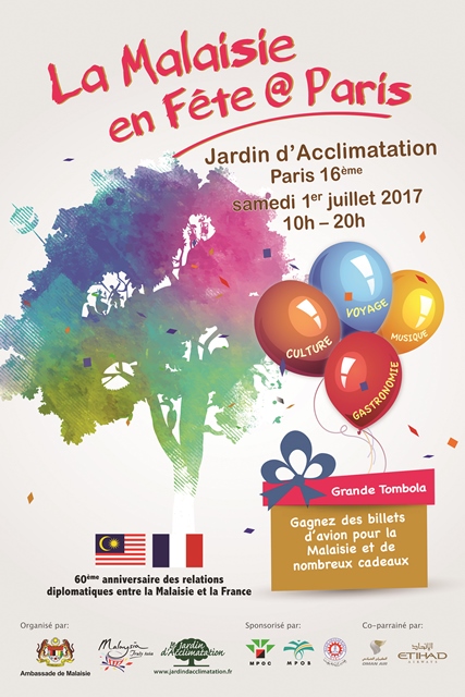 Le 1er juillet 2017, l’ambassade de Malaisie organise une véritable fête malaisienne au Jardin d’Acclimatation, afin de faire découvrir aux parisiens la richesse de son pays. Après S.E. Dato Ibrahim Abdullah, Ambassadeur de Malaisie en France « Il s’agit des célébrations des 60 ans de relations bilatérales entre la France et la Malaisie. Nous invitons tous les visiteurs à se joindre à nous et nos partenaires pour ce festival qui célèbre la culture et l’art de la Malaisie. »