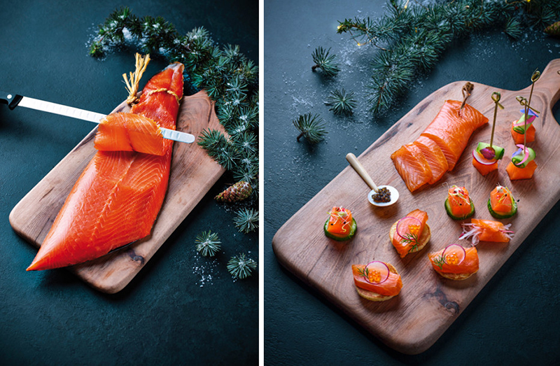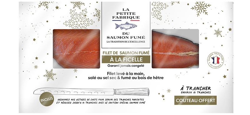 Convivialité, amour et partage : Notre vision pour les fêtes de fin d’année ! La Petite Fabrique du Saumon Fumé imagine donc un filet de saumon entier sur peau, fumé traditionnellement à la ficelle ; l’illustration parfaite de son amour du saumon et de son savoir-faire français.