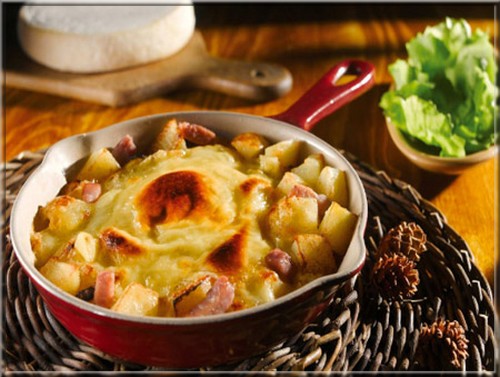 5.Alternez plusieurs fois une couche de pommes de terre et une couche de Reblochon en lamelles. Saupoudrez de sel, de poivre et ciboulette entre chaque couche.