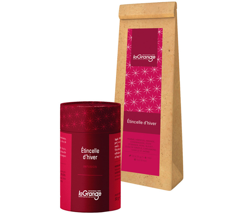 Infusion à base de pomme, d'hibiscus, amande, cynorhodon, zeste d'orange, rose, bleuet, clou de girofle, cardamome et vanille. Avec un tel assemblage de fruits, fleurs et épices, une véritable Étincelle de lumière au beau milieu des longues nuits d'hiver !