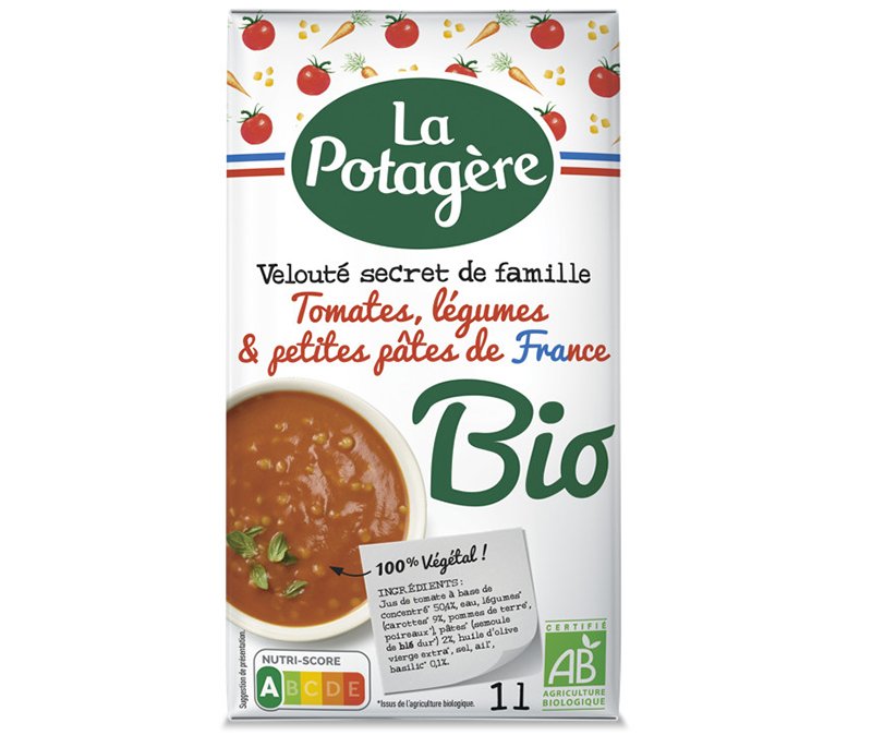 La Potagère, entreprise bretonne basée dans le Finistère, propose des soupes Bio 100% végétales composées uniquement de légumes français. Elle a fait de sa liste d’ingrédients courte et clean sa signature, affichée en toute transparence sur le facing de ses soupes !