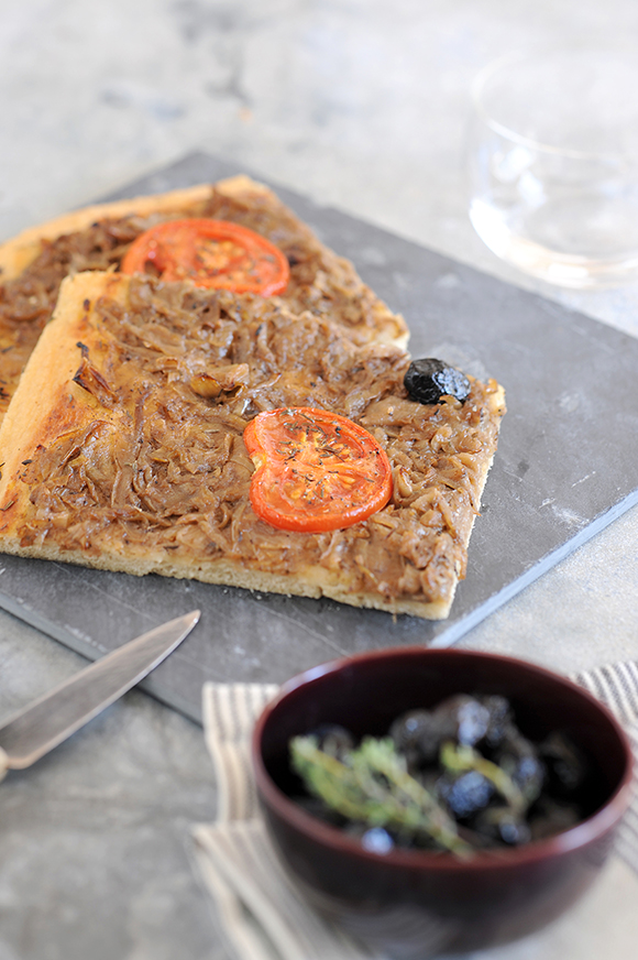 Une pâte croustillante et parfumée à l'huile d'olive, un confit d'oignons caramélisés.