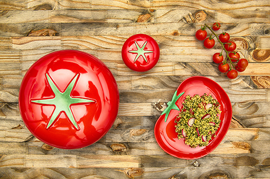Reine des jardins potagers, la tomate le sera aussi à votre table, avec cette série plus que réaliste d’accessoires pour la cuisine.