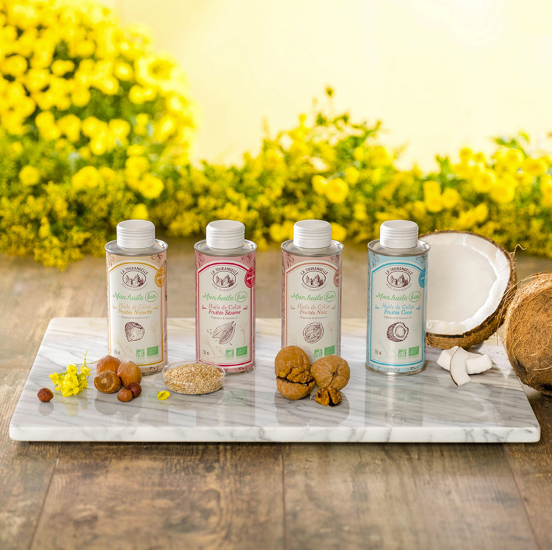 La gamme "Mon huile bio" allie l'huile bio de Colza particulièrement riche en oméga 3, au goût intensément fruité des Noix, Noisettes, Sésame et Noix de Coco bio. Ces 4 huiles sont élaborées à Saumur (Vallée de la Loire) selon le savoir-faire unique et ancestral de la Tourangelle.