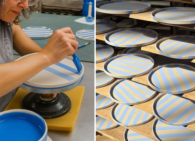 Au cœur de notre atelier au Portugal, chaque rayure de la collection Linhas est appliquée à la main, une à une, par nos céramistes. Un geste minutieux, presque méditatif, répété avec exigence et douceur, mais jamais tout à fait identique.