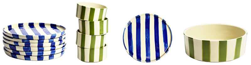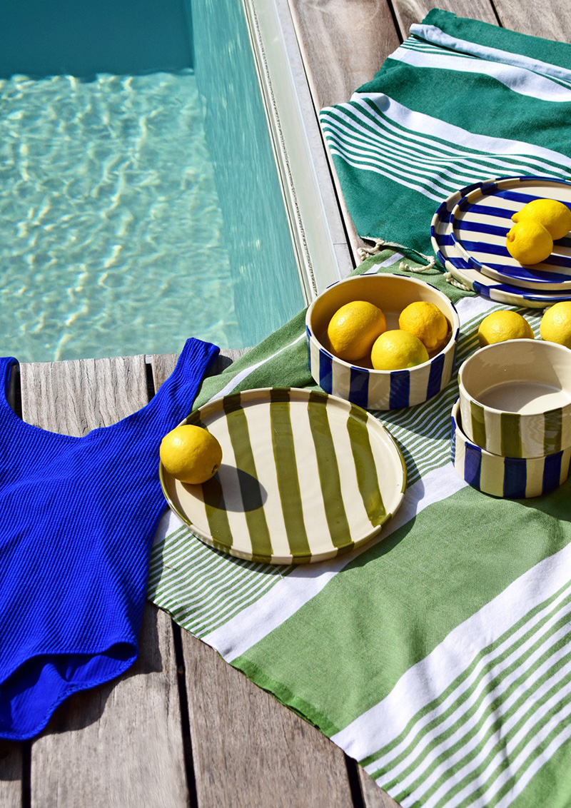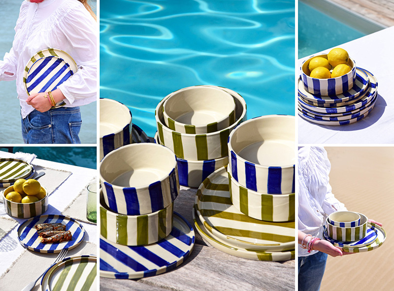 Assiettes et bols se parent de leurs plus belles rayures, comme des vagues dessinées à main levée sur le grès.