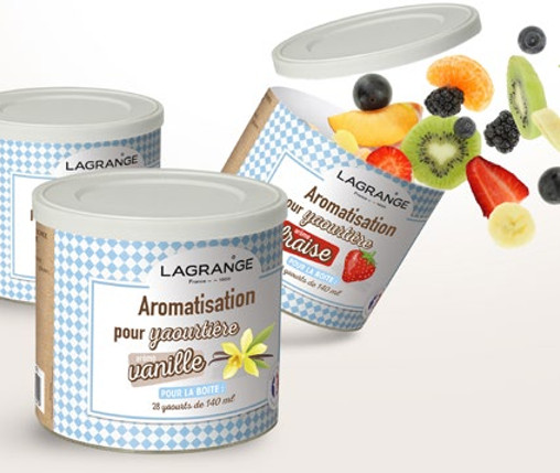 Clin d'oeil Pour s’adapter aux goûts de chacun, LAGRANGE propose toute une gamme d’aromatisations aux saveurs gourmandes : vanille, fraise, coco, pêche, caramel au beurre salé, citron ou framboise. Simples et rapides, ces arômes s’incorporent à la préparation, il ne reste qu’à laisser la yaourtière fonctionner et déguster.