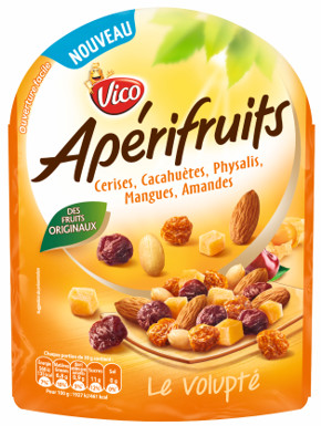 Apérifruits Volupté, c’est l’association inédite de fruits originaux, comme la cerise, la mangue et le physalis, et de noix croquantes pour un maximum de gourmandise.