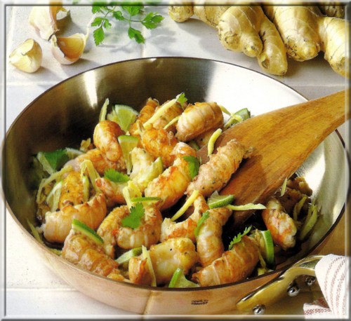 4-Verser de nouveau l'huile dans la poêle, ajouter l'ail coupé en fines lamelles, faire chauffer à feu doux quelques instants et retirer l'ail avant d'y déposer les queues de langoustines. Les cuire à feux vif 30 secondes en retournant, ajouter les quartiers de citrons, râper la racine de gingembre pour en obtenir 1/2 cuil. à café ; mélanger aux langoustines. Cuire à nouveau 2 minutes en remuant.