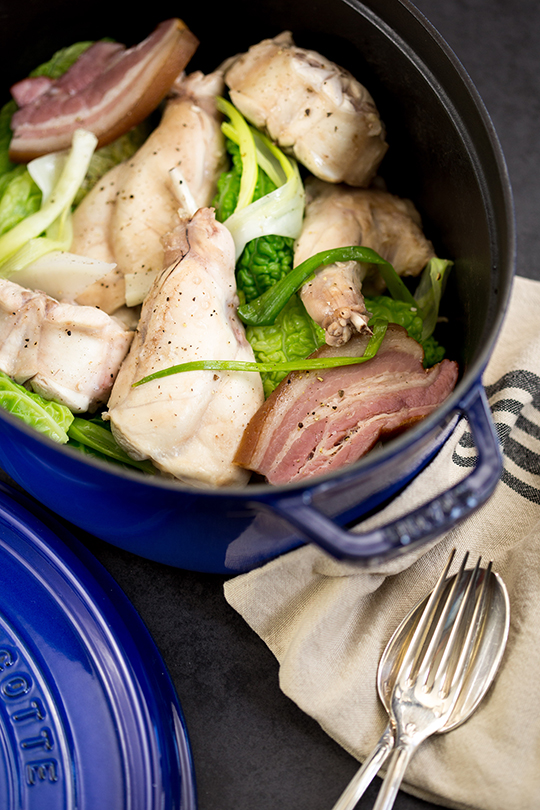 ③• Dans la cocotte déposer les légumes, les morceaux de lapin, le lard fumé et la sauge.