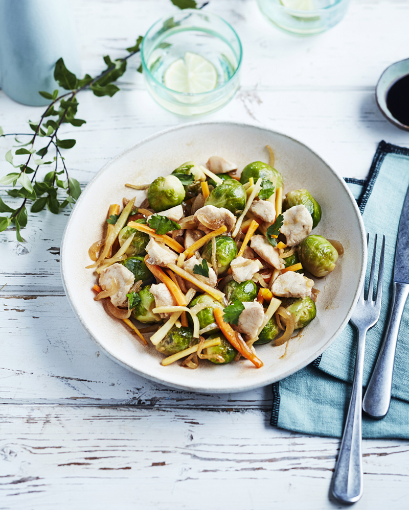 ⑦• Puis, ajoutez les choux de Bruxelles ainsi que la sauce soja, du sel et du poivre.