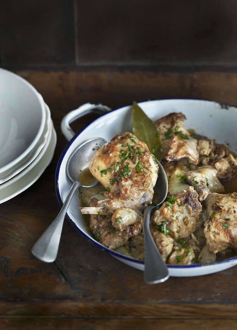 ①• Dans une cocotte, dorez dans de l’huile d’olive chaude les morceaux de lapin de tous les côtés. Quand ils sont bien colorés, retirez-les et remplacez-les par l’oignon émincé et 4 gousses d’ail entières. Faites-les revenir en remuant à feu doux puis remettez les morceaux de lapin.