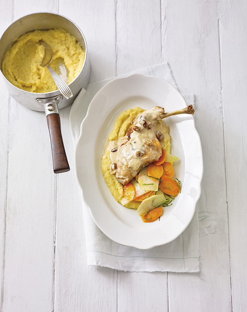 ④• Pour l’accompagnement : faites cuire les carottes et les navets coupés en rondelles 15 minutes à la vapeur. Préparez la polenta : portez à ébullition le bouillon dans une casserole et versez la polenta en pluie. Baissez le feu et laissez épaissir le tout à petit feu tout en remuant pendant 5 minutes. Incorporez le fromage et mélangez.