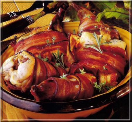 4.Après 30 mn, entourer chaque morceau de 2 tranches de lard fumé, les remplacer dans le plat et poursuivre la cuisson 10 mn. Accompagner d'un paillasson de pommes de terre ou de gnocchis.
