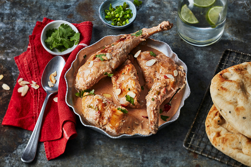 Servir sur du riz et parsemer le lapin de coriandre et d’amandes torréfiées.