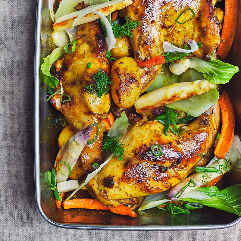 Lapin rôti et légumes de saison rôtis aux épices colombo