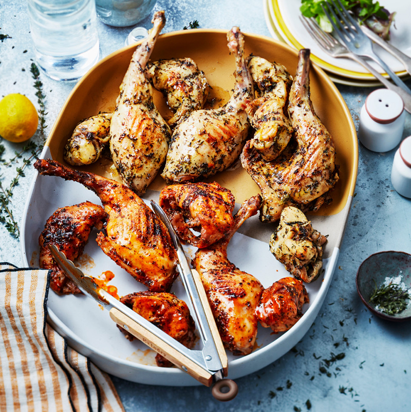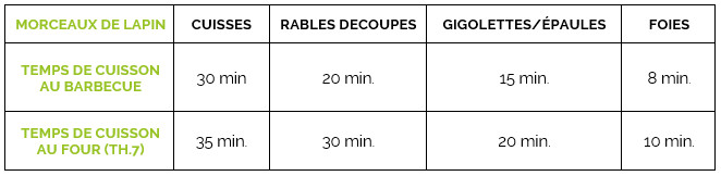 ③• Faites cuire selon vos envies et le temps indiqué dans le tableau. Déposez les morceaux de lapin sur la grille de votre barbecue et retournez la viande à mi-cuisson – OU – La cuisson de la viande de lapin peut aussi être réalisée au four préalablement préchauffé (210°C/ Th.7). 4 minutes avant la fin de la cuisson, mettez le four en position gril.