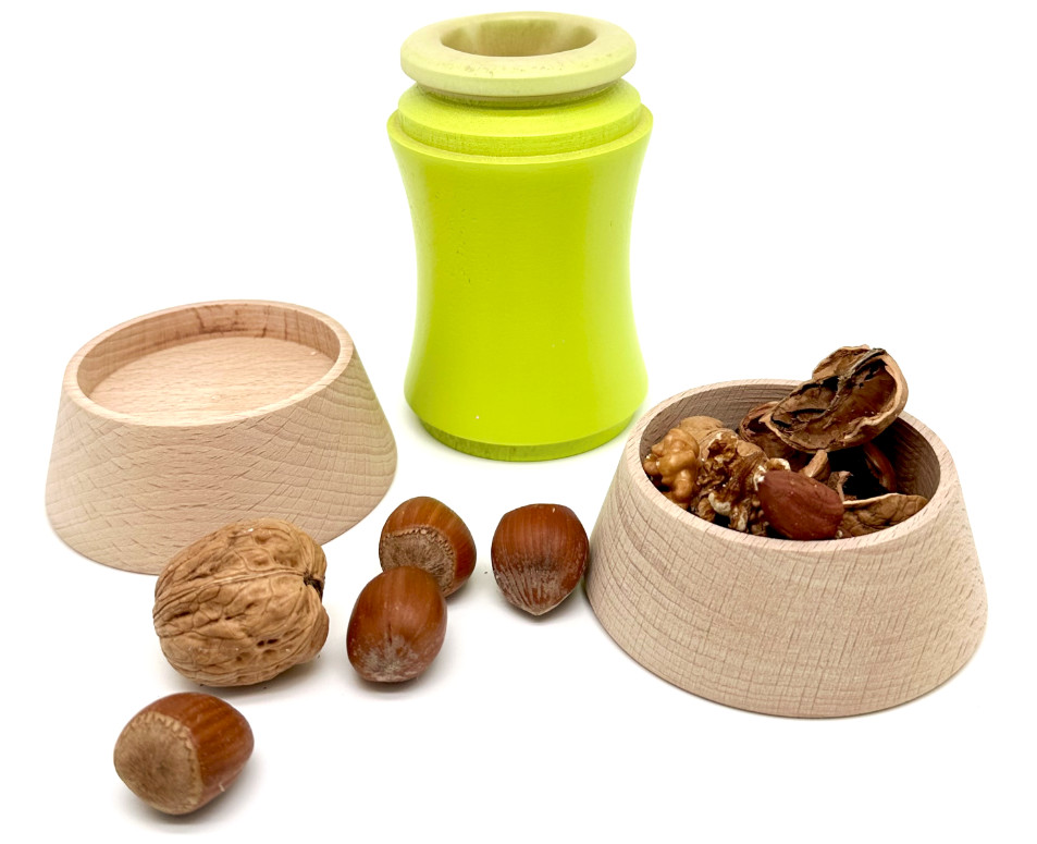 Composé de 3 pièces en bois, ce casse-noix révolutionnaire et design permet de casser tous les fruits à coques de manière simple, efficace et ludique grâce à son système de propulsion breveté.