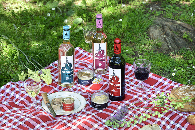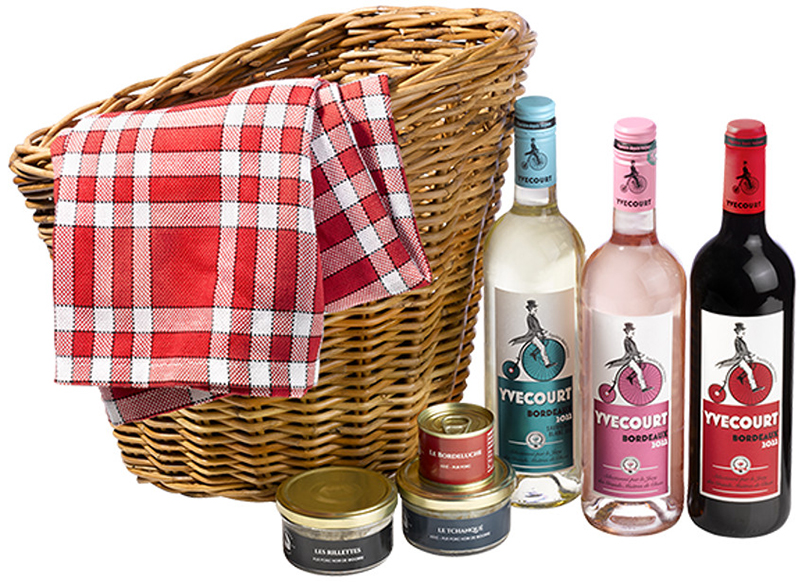 Yvecourt a glissé dans un joli panier en osier adapté à tous les vélos, la traditionnelle nappe vintage à carreaux rouge et blanc de nos grands-mères, un ensemble de terrines artisanales Bordelaises des « Conserves Gardes », accompagnés bien sûr des 3 cuvées Yvecourt qui s’accordent merveilleusement bien de l’apéro au diner !