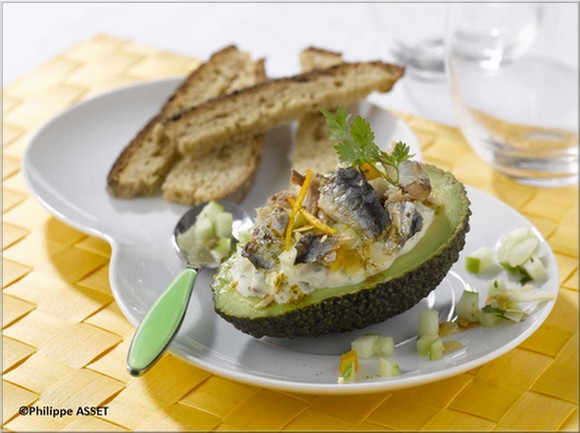 8- Ouvrez les avocats en deux dans le sens de la longueur, ôtez le noyau et garnissez le centre du mélange ci-dessus.
