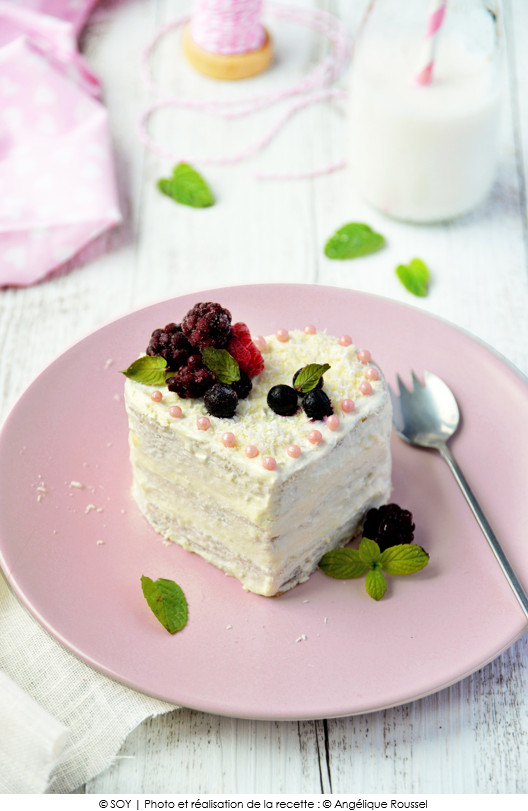 – Placer un 1er cœur sur une assiette et le couvrir de crème aux fruits rouges. Placer un second cœur par-dessus, couvrir à nouveau de crème et terminer par un 3ème cœur.