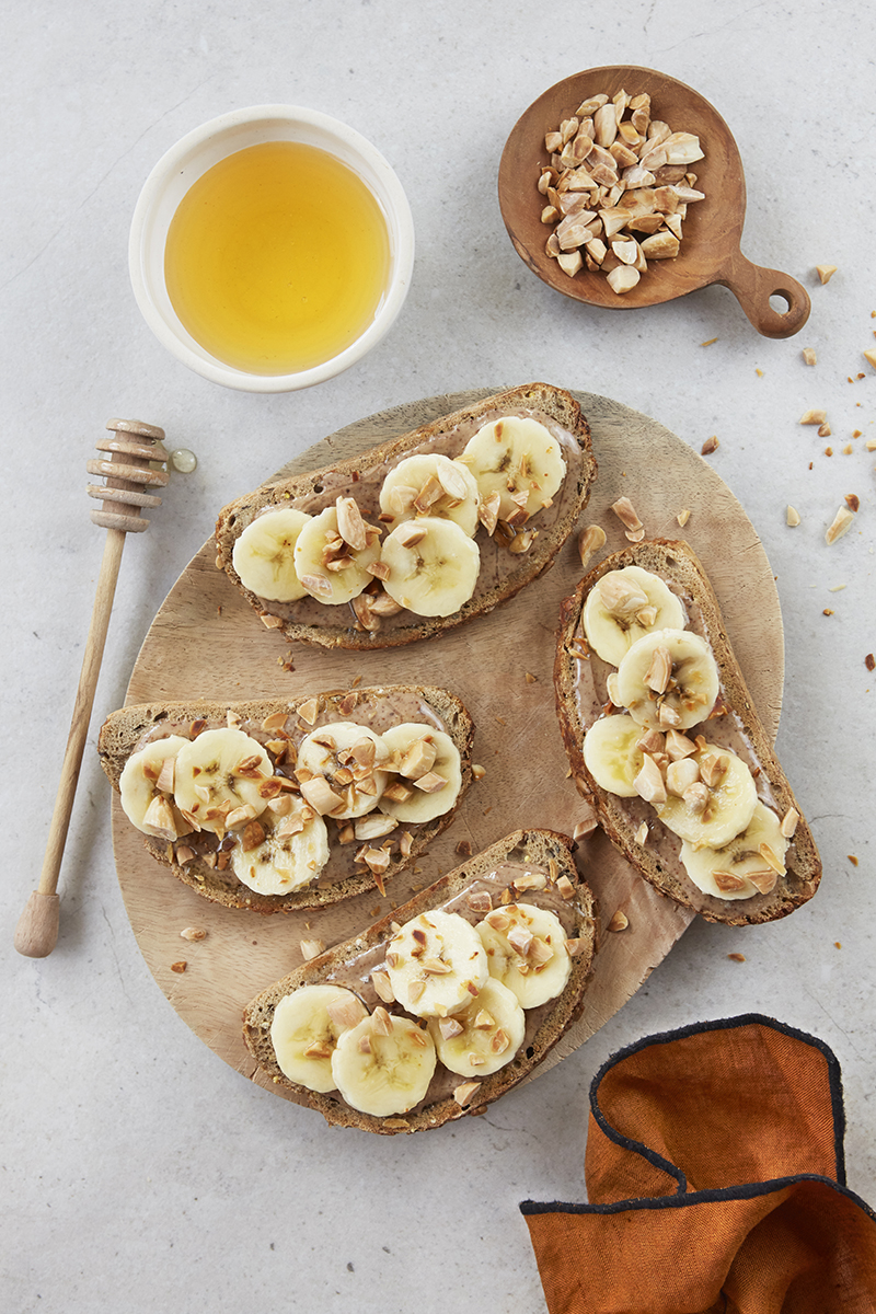 ②• Toaster les tranches de pain puis les tartiner de purée d’amandes complètes.