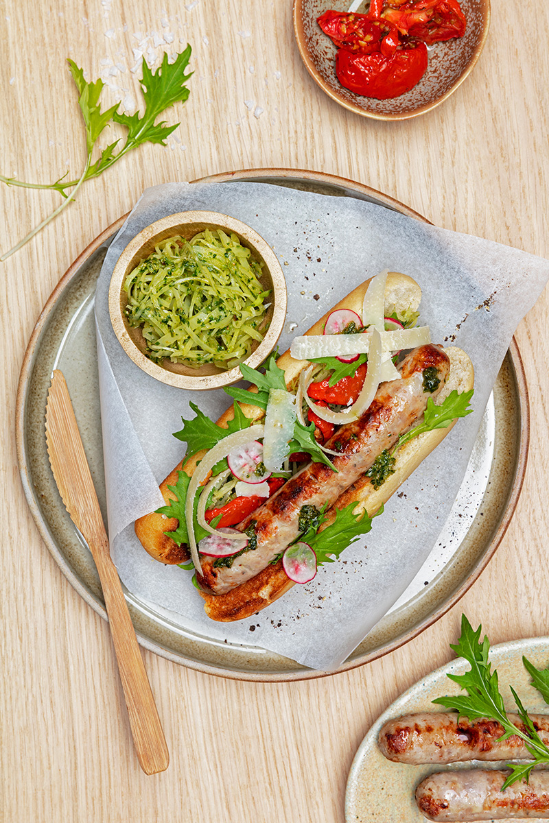 ⑥• Disposer la saucisse dans le pain avec un peu de pesto, le chou assaisonné, les pluches de salade, des copeaux de parmesan, les tomates confites et de fines rondelles de radis rose pour apporter de la couleur et du piquant.